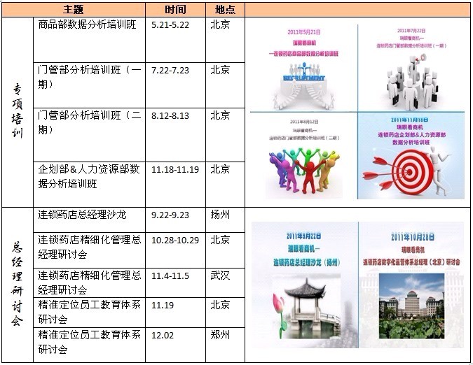 2011瑞商人一直在行动着,从北京一路向下,郑州、扬州、武汉,连锁药店破冰之旅在今年只是告一段落,这只是个开始。“创新则生,守旧则死”,2012,我们会再次出发。  感恩是一份美好感情,是一种健康心态,是一种良知,是一种动力: 瑞商网感谢有你们,在药店管理运营的学习中取精华弃糟粕; 瑞商网感谢有你们,能在医药行业的发展道路上沉淀下来深刻思考; 瑞商网感谢有你们,让医药零售行业的这片土地得到滋润,并时时闪烁纯净的光芒。 | 《满心感激话回忆》 2010年瑞商网首届连锁药店数据分析师培训班伴随着细雨在石家庄揭开帷幕,转瞬间大半年过去,瑞商人即将拉开连锁药店8大核心部门专场培训的帷幕。我们在回忆中,期盼、兴奋、感激、不安的心情混杂……回眸过往的日子,我们彼此共同收获的不仅是专业更是真心…… | | | 《万水千山总是情》 2011年5月22日的下午清风徐徐,阳光明媚,往日热闹的清华园在周末也变得越发安静。连锁药店商品部数据分析培训会也在这样一个温暖的午后结束了,各位同学在不舍中依依惜别…… |  | | 《瑞眼看商机—连锁药店总经理沙龙感谢函》 在连锁药店发展的道路上,策略方向的指引、知识体系的建设都已经日渐成熟,但是落地方法的指导却迫在眉睫。传统医药零售行业不仅需要创新也更需要沉淀,锐意进取的企业及企业家在深思、在行动…… |  | | 《北京研讨会感谢函》 从旁观者的角度审视“一把手”,我们看到的是威严的表情、是赞赏的掌声、是成功的喜悦……但“一把手”的危机意识你可曾了解?“一把手”所承载的重负你可曾解读?…… |  | | 《珍重伙伴,感谢有你》 11月18—19日,瑞商网数据分析培训班—企划部&人力资源部专场圆满结束,您用行动证明了,传统医药零售行业要创新、要革命,不能只是一纸空文;瑞商人用先进的理念证明了,助理连锁药店数字化运行的决心…… |  | | 《瑞商课堂让问题皆浮云》 连锁近些年培训做了一轮又一轮,人、财、物投入了一拨又一拨,可还是怨声载道。老板说,我花钱不讨好;员工说,我受累不讨好。众口齐道:培训不懂我的心!…… |  | | 《玩转“督导”之猫鼠大战》 督导人员就相当于城管,哪儿有问题就出现在哪儿,很难与小贩们打成一片,表面上的也比较难。督导管理,也在不断实践中总结完善,如今产生新的发展形势:导为主来,督为辅…… |  | | 《瑞商课堂欢迎您!》 培训新模式,新体验:“时尚IT技术+传统医药零售=完美组合”;真实网络环境搭建,数据分析实战演练;信息时代,与时俱进,拒绝OUT!…… |  | |