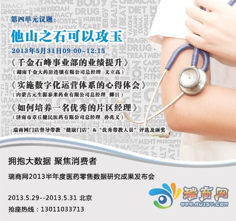 瑞商网的会议已经连续两年进行“他山之石可以攻玉”的客户分享环节了。在这个环节中,来自天南海北的合作伙伴面对同样的问题,却有着不同的见解,让身在其中的我们总是有意想不到的思想碰撞。 我们需要周围成功的经验不断发展自己,也需要了解其它药店的现状清楚自己的位置。这就是“他山之石可以攻玉”的意义。 从门店运营、数据应用以及人才管理三个角度,瑞商网的三位特邀嘉宾,将在“拥抱大数据 聚焦消费者—瑞商网2013半年度医药零售数据研究成果发布会”第四单元与您分享: - 《千金石峰事业部的业绩提升》(湖南千金大药房连锁有限公司总经理 文立高)